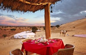 After one has pulverized rippling sand dunes, a memorable evening awaits in the camp accommodation. Enjoy the primeval energy of the Arabian Nights blended in the atmosphere with the flames of bonfire and lyrical movements of the dancers, dressed in their traditional “gaghra-choli”, pulsating on the rhythms of the shrill folk songs. With the increasing beats of the drums, the dancers whirl faster and faster around the bonfire, just an aesthetic sight that has to be seen to be believed. As the evening progresses, dinner is served in the traditional Indian seating arrangement. Dinner with delicious barbecue is accompanied by music from the “Manganiyar” musicians, creating mesmerizing euphony with their ‘dholaks’ and ‘sarangis’. Take a sip of chilled beer while sittting on the capacious Indian style beds called “charpais” (jute beds) as you tilt your head and see the sprawling desert sky bewildering everyone with millions of twinkling stars. As the temperature drops and the ambience chills, enjoy the romance and enigma associated with such a night.